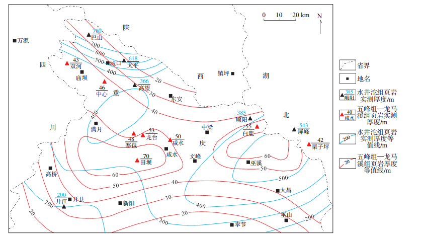 下载eps/tif图 图 1 渝东北地区水井沱组和五峰组—龙马溪组页岩厚度叠合 Fig. 1 Thickness overlay map of Shuijingtuo Formation and Wufeng-Longmaxi Formation shale in northeastern Chongqing |