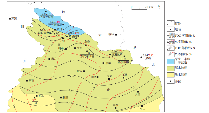 富有机质页岩镜质体反射率(Ro)为2.27%~ 3.87%,平均为3.07%,主体属于高—过成熟阶段,有机质类型主要为Ⅰ型。上奥陶统五峰组—下志留统龙马溪组暗色页岩TOC质量分数主要为1%~ 5%,最大值为6.74%,见于满月隧道西剖面,该剖面TOC质量分数平均值为4.74%。纵向上,自下而上TOC含量亦表现出逐渐变小的特征,变化范围较大,TOC质量分数大于2.0%的优质页岩段分布于五峰组—龙马溪组底部,平均厚度约45.2 m;平面上,高TOC含量区主要集中在满月隧道西、寨包管家湾、巫溪龙台干河坝一带,TOC质量分数主要为3.03%~6.74%,平均为4.90%,整体上表现为TOC高含量区向北和向南均减小的趋势(图 3)。