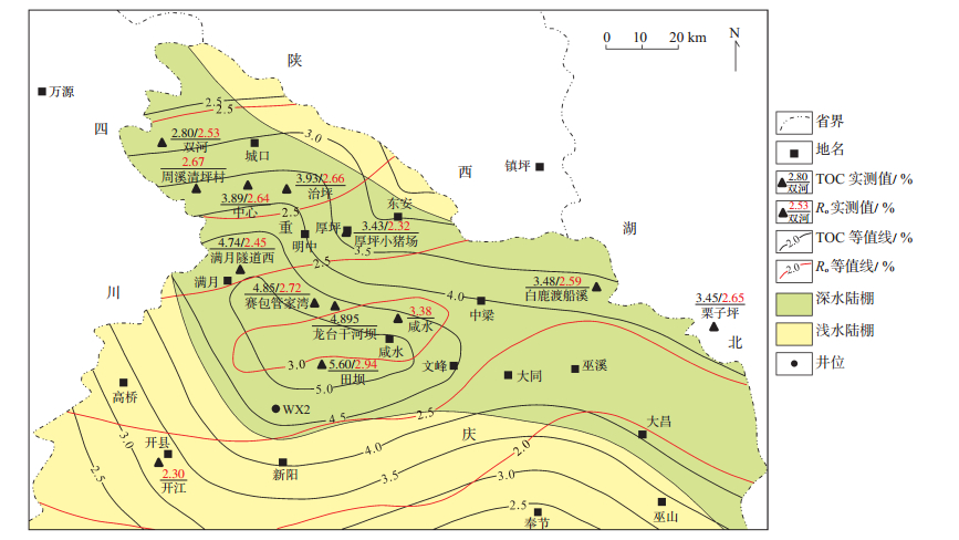 下载eps/tif图 图 2 水井沱组TOC含量和Ro平面分布叠合 Fig. 2 TOC content and Ro overlay map of Shuijingtuo Formation shale |