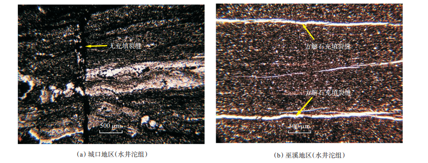 下载eps/tif图 图 4 渝东北地区下古生界页岩构造微裂缝特征 Fig. 4 Characteristics of structure fractures of Lower Paleozoic shale in northeastern Chongqing |