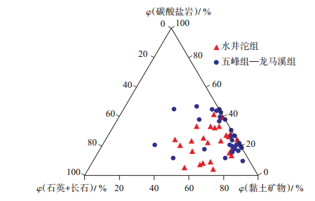下载eps/tif图 图 5 渝东北地区下古生界页岩矿物组成三角图 Fig. 5 Triangular diagram of mineral composition of Lower Paleozoic shale in northeastern Chongqing |