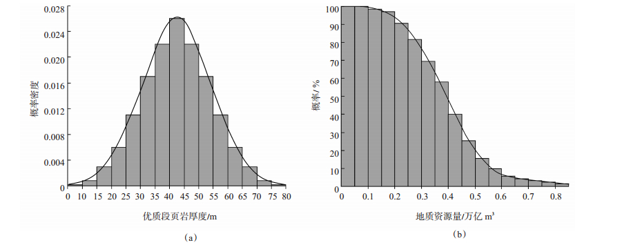 体积法是目前进行页岩气资源评价应用最广泛、精度最高的方法[28-32]。页岩气地质资源量表示为页岩重量与单位重量页岩所含天然气的乘积。若研究区勘探程度较低,无法获取页岩总含气量,亦可通过分别计算吸附气含量和游离气含量的方法进行计算。考虑到使用体积法进行页岩气资源评价时所涉及的关键参数在纵向、横向上均表现出很明显的非均质性,因此引入了统计学中概率论的概念,建立关键参数分布模型[图 6(a)],以概率的形式赋值,得到不同概率条件下的页岩气资源[图 6(b)],形成条件体积概率法[31]。