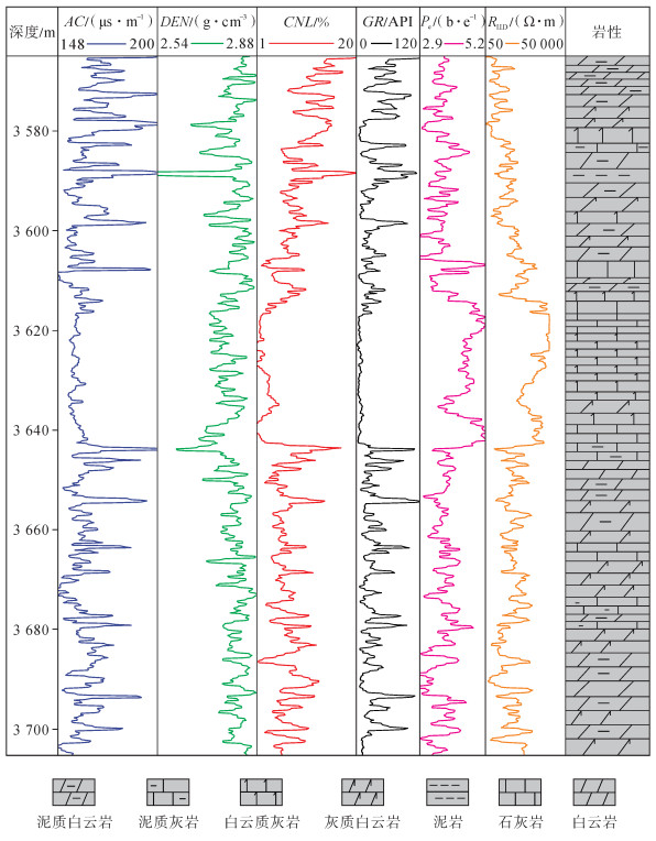 选取6种对碳酸盐岩岩性反映敏感的测井曲线,即声波时差(AC)、自然伽马(GR)、光电吸收截面指数(Pe)、补偿中子(CNL)、补偿密度(DEN)、深侧向电阻率(RLLD), 统计不同岩性的测井响应平均值及方差(表 1),梳理各岩性的测井参数特征。石灰岩自然伽马较低,光电吸收截面指数较高;白云岩自然伽马较低,通常小于30 API,补偿中子通常大于5%,光电吸收截面指数较低;泥岩自然伽马较高,其值为87~177 API不等,补偿中子通常高于35%,声波时差较高;泥质白云岩由于含泥的特点,自然伽马较高,通常大于30 API,并随着泥质含量的增加而有所增大;其他测井曲线的平均值均介于泥岩和白云岩的特征值之间;同理,白云质灰岩、泥质灰岩、灰质白云岩,也具有与泥质白云岩相似的性质。