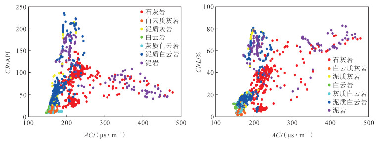 下载eps/tif图 图 2 苏东41-33区块44-20井马五段GR-AC和CNL-AC交会图 Fig. 2 GR-AC & CNL-AC crossplots of well 44-20 in Sudong 41-33 block |