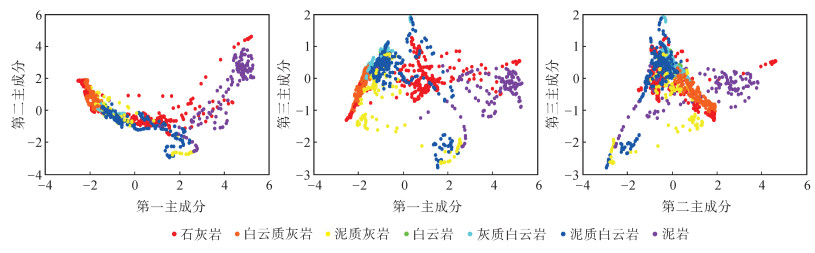 根据主成分分析结果,绘制出主成分(Y1, Y2和Y3)之间的二维交会图(图 3)。从图 3可以看出,各类样本有了明显的区分界限,泥岩、白云质灰岩、石灰岩、泥质白云岩等分布界线清晰,泥质灰岩、白云岩、灰质白云岩等也可在交会图中看到一定的分布规律。与图 2中大量样本混杂重叠的现象相比,图 3中的交会图已经可以进行粗略的人工区分,这说明利用主成分分析有利于解决样本变量间存在大量相关性的问题。通过观察图 3中每类样本的分布,可以看到多数样本围绕该类的中心分布,比较容易识别,然而,分散在不同岩性交界处的样本极易错分,识别难度较大,因此如何正确识别边界处的样本是提升方法效率的关键。