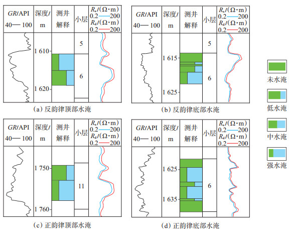 随着注水油田进入高含水开发阶段,由于沉积韵律、粒度等因素的影响,砂体纵向上存在渗流差异,韵律性成为影响层内剩余油分布规律的重要因素之一。近年来,越来越多的储层内部非均质性研究[10-13]表明,夹层作为储层内部渗流屏障,可以阻止注入水的垂向运移,影响水淹在纵向上的发育部位和发育程度,对界面上下油层中剩余油的分布产生影响。