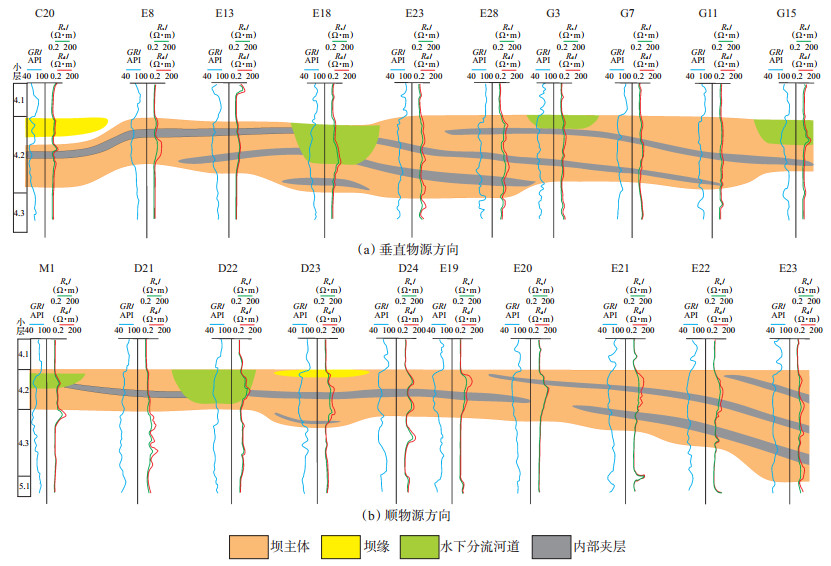 夹层识别要在岩心识别的基础上进行,通过岩电标定和典型测井曲线(自然伽马、浅侧向电阻率和密度)分析,建立了夹层测井识别标准,进而对未取心井进行夹层识别[6]。结合A油田的实际情况,采用“模式指导、多维互动、动态验证”的思路,在三角洲前缘储层构型模式的指导下,结合密井网区生产动态及水淹解释资料,确定了A油田内部夹层的展布特征,主要表现为顺物源的“前积式”和垂直物源的“上拱式”展布样式(图 2)。内部夹层以泥质夹层和物性夹层为主,偶见钙质夹层。层内泥质夹层与物性夹层的区分主要表现在孔隙度和渗透率等方面:泥质夹层孔隙度、渗透率很低,基本不具有渗透性,而物性夹层具有一定的孔渗性,但未达到有效储层的物性下限。夹层展布多与沉积界面大致平行,平面相对稳定,钻遇率一般为70%,岩性以细砂岩、泥质粉砂岩、粉砂质泥岩为主。厚度为0.3~1.5 m,平均厚度小于1 m,延伸长度为200~1 000 m,宽度为200~800 m,渗透率普遍小于10 mD。