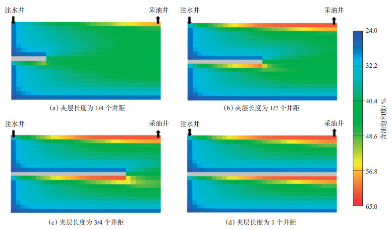 (2) 夹层的延伸规模对层内剩余油分布具有明显的控制作用,随着夹层延伸长度变长,夹层顶部和底部区域的剩余油也更加富集。