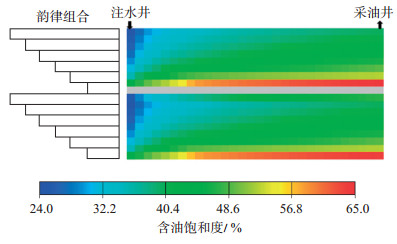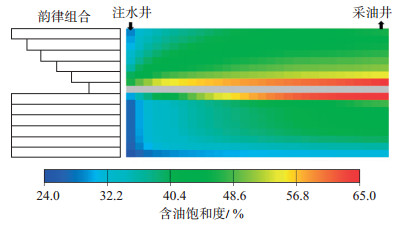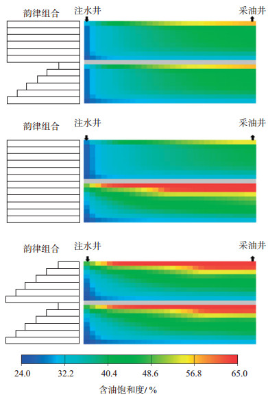 剩余油主要分布在夹层之下的韵律层顶部区域。此类模式为均质韵律和正韵律砂体垂向叠加组合,主要为三角洲前缘水下分流河道砂体沉积,在研究区普遍发育。从图 7可以看出,无论是均质韵律与均质韵律组合、正韵律与正韵律组合及均质韵律与正韵律组合,均表现为夹层底部剩余油富集的特征。由于夹层上下2个砂体内部渗透率级差较小,在重力作用的影响下,易于形成底部强水淹,顶部水淹程度相对较弱,剩余油富集。上下2个砂体之间由于夹层的存在,会形成渗流屏障,阻碍注入水向下运移。最终会形成剩余油主要分布于夹层之下砂体顶部相对高渗透的区域(图 7)。