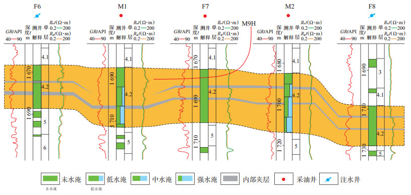 上述夹层控制下的剩余油分布模式研究有效指导了A油田的剩余油挖潜实践[14-15],并取得了较好的开发效果。以油田F6-M2井组为例,M1与M2井均是2013年油井排加密实施的2口调整井(图 8),从钻后水淹规律来看,纵向上动用程度不均,砂体中下部水淹程度强,顶部水淹程度弱,特别是M2井投产后含水率高达95%,测试资料显示该井4.2单层为主要产水层。针对M2井组生产情况,经储层构型精细解剖分析后认为:4.2单层主力砂体为水下分流河道沉积,底部已形成强水淹优势渗流通道,但由于砂体内部夹层发育,能够遮挡注入水垂向运移,使注入水主要沿夹层下部波及,顶部动用程度低,仍然有大量剩余油富集。在油田后续调整中,在该套砂体的顶部部署实施了水平井M9H来挖潜剩余油,M9H井投产初期产油量达100 m3/d,含水率一直维持在30%以下,实施效果良好。