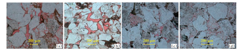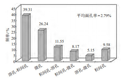 研究表明:研究区长6储层孔隙组合类型主要有孔喉半径相对较大的溶孔-粒间孔型、粒间孔-溶孔型、粒间孔型;孔喉半径相对较小的粒间孔-微孔型、微孔型、溶孔-微孔型。长6储层平均面孔率为2.79%,溶孔-粒间孔型储层占39.31%[图 1,图 2(a)]、粒间孔型储层占9.58% [图 1,图 2(b)]、粒间孔-溶孔型储层占11.55% [图 1,图 2(c)],微孔型储层占26.24%、粒间孔-微孔型储层占8.17%、溶孔-微孔型占5.15% [图 1,图 2(d)]。