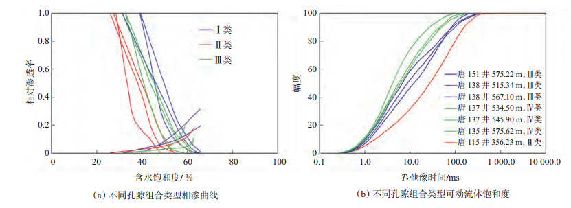 (1)溶孔-粒间孔、粒间孔型储层属于Ⅰ类样品:此类储层可动流体饱和度最大,等渗点处相对渗透率最大,两相共渗区范围最宽,渗流能力强,开采难度最低。