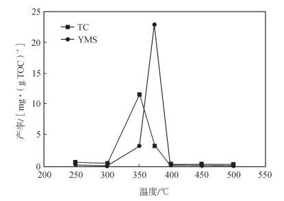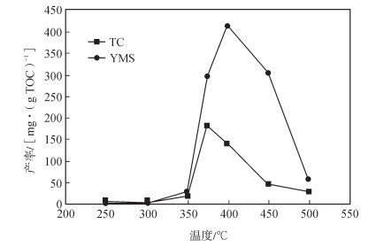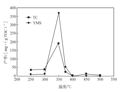 残留油实际上为模拟后的固体残渣经氯仿抽提所得到的氯仿沥青“A”的含量,即为可溶沥青(也指在矿物表面附着的可溶有机质[31])。这部分残留油有以下2个来源:①由干酪根经热演化而形成的;②与不溶有机质共存的那部分原始状态存在的可溶有机质[32],即在整个热演化过程中未曾离开烃源岩和未曾受到热裂解作用的那部分残留的原始可溶有机质。由此可见,得到的残留油产率由生成的和原始残留的两部分可溶有机质组成(图 3)。同时,也可以将残留可溶有机质的变化过程划分为3个部分:①250~300 ℃阶段,两者的残留油含量均基本不变,但是此阶段TC样品的残留油平均值高于YMS样品约26.335 mg/(g TOC);②300~400 ℃阶段,残留油产率均出现先增高至最大值而后再减小的趋势,而峰值均出现在350 ℃,但是TC样品的峰值为191.133 mg/(g TOC)较YMS样品的峰值[367.021 mg/(g TOC)]小了175.888 mg/(g TOC);③400~500 ℃阶段,两者残留油产率都为热演化阶段的最低值,且基本没有变化。