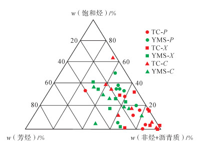 下载eps/tif图 图 4 TC和YMS样品排出油、洗出油及残留油族组分分布 Fig. 4 Group compositions of expelled, wash-out and residual oils |