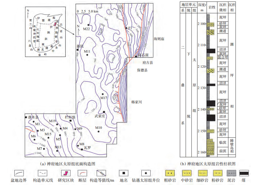 下载eps/tif图 图 1 神府地区太原组底面构造图(a)与岩性柱状图(b)(据文献[9]修改) Fig. 1 Bottom structure(a) and lithological column(b)of Taiyuan Formation in Shenmu-Fugu area |