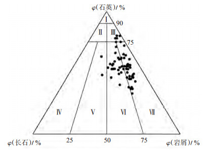 下载eps/tif图 图 2 神府地区太原组储层岩石学特征 Ⅰ.石英砂岩;Ⅱ.长石石英砂岩;Ⅲ.岩屑石英砂岩;Ⅳ.长石砂岩;Ⅴ.岩屑长石砂岩;Ⅵ.长石岩屑砂岩;Ⅶ.岩屑砂岩 Fig. 2 Triangular diagram of sandstone components of Taiyuan Formation in Shenmu-Fugu area |