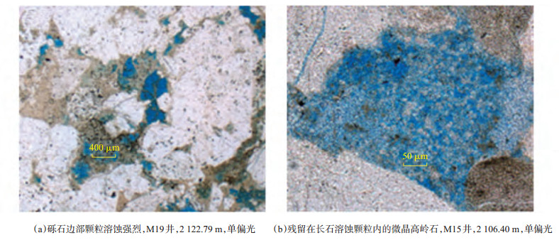 3.1.3 溶蚀作用溶蚀作用可以使长石和酸性喷发岩岩屑等岩石组分溶解,产生次生孔隙,提高储层孔隙度,但对于储层渗透率的影响未必都是有利的。当储层矿物溶蚀作用强烈时,次生孔隙以粒间溶孔为主,粒内溶孔往往因溶蚀强烈而彼此连通,且长石溶蚀所产生的高岭石微晶也容易被流体带走[14],从而使岩石渗流能力增强;当储层矿物溶蚀程度较低时,储层次生孔隙多以孤立形式存在,长石溶蚀所产生的高岭石微晶因无法完全被孔隙流体带走而导致部分流体被残留在孔隙内,当后期储层温度、压力等环境条件改变后,高岭石微晶结晶析出,从而造成喉道阻塞,反而会降低储层的渗流能力。