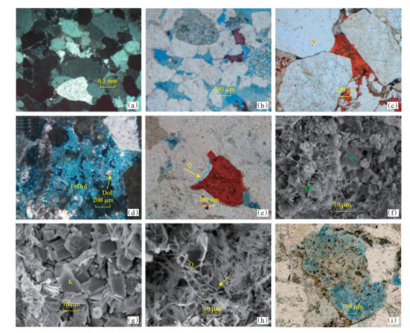下载eps/tif图 图 7 神府地区太原组砂岩储层特征 (a)颗粒呈线—凹凸接触,M19井,2 122.79 m,正交光;(b)残余原生孔,F1井,1 367.93 m,单偏光;(c)方解石胶结颗粒,M22井,1 719.7 m,单偏光;(d)铁白云石交代白云石,M9井,1 792.51 m,正交光;(e)方解石包裹石英次生加大,M22井,1 718.22 m,单偏光;(f)伊/蒙混层包裹矿物颗粒,F1井,1 361.25 m,扫描电镜;(g)长石溶蚀形成高岭石,边部高岭石向伊利石转化,M15井,2 106.4 m,扫描电镜;(h)发丝状伊利石,M15井,2 106.4 m,扫描电镜;(i)酸性喷发岩岩屑颗粒溶蚀,M19井,2 133.51 m,单偏光 Fig. 7 Microscopic characteristics of sandstone reservoir of Taiyuan Formation in Shenmu-Fugu area |