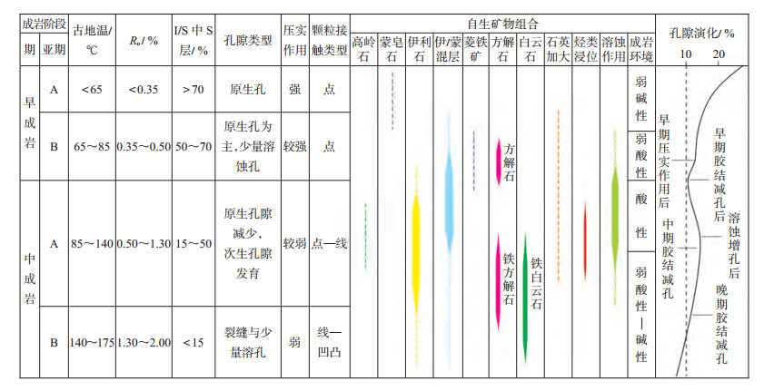 3.2 成岩序列通过对神府地区太原组泥岩镜质体反射率(Ro)、有机质最高裂解温度(Tmax)及伊/蒙混层中蒙脱石含量等的分析发现,太原组泥岩Ro为0.84%~1.21%,Tmax为450~490 ℃,通常在460 ℃左右,伊/蒙混层中蒙脱石体积分数为12%~35%。由碎屑岩成岩阶段划分标准[17]可知,神府地区太原组成岩作用阶段普遍在中成岩阶段A期,部分可达中成岩阶段B期(图 8)。根据自生矿物之间及其与碎屑颗粒之间的接触关系,确定神府地区太原组典型成岩序列为:早期压实和黏土包壳→Ⅰ期石英加大→菱铁矿和方解石胶结→长石溶蚀→自生高岭石和Ⅱ期石英加大→自生伊利石胶结→白云石、铁白云石及铁方解石胶结。碎屑颗粒首先经历早期的机械压实,由于神府地区太原组泥质杂基含量较高,碎屑颗粒常伴有黏土包壳,随着压实程度的进一步加强,碎屑颗粒发生压溶作用,其溶解所产生的二氧化硅形成了Ⅰ期的石英加大;随后发生了早期的方解石沉淀和菱铁矿的形成[18],虽然下二叠统储层早期受煤系地层影响,整体处于酸性环境[19],但由于储层非均质性强,局部仍然保留了少量的方解石胶结物;在有机酸大量充注后,酸性喷发岩岩屑和长石发生溶蚀所产生的矿物离子促进了自生高岭石和Ⅱ期石英加大的形成;随着成岩演化程度的加深,黏土矿物向伊利石转化,地层水逐渐变为碱性,含铁的碳酸盐矿物如铁方解石和铁白云石开始形成。