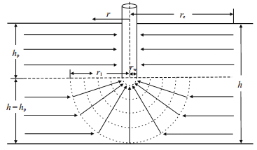 2.2 未射开层段产能公式对于未射开层段,即h-hp气层段,气体的流动为球面向心流和平面径向流的结合,在近井地带(rw < r < r1)为球面向心流,在远井地带(r1 < r < re)仍为平面径向流,下面分别推导这两部分的产能计算公式。