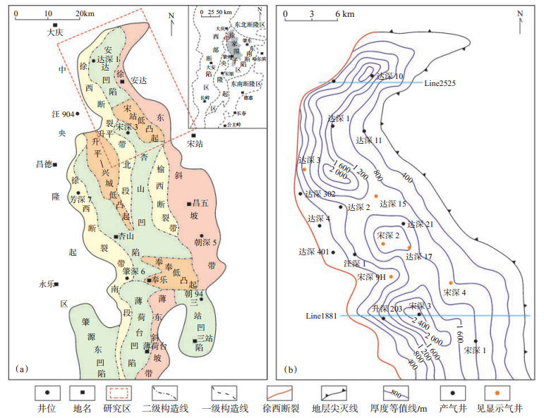 下载eps/tif图 图 1 徐家围子断陷北部构造位置(a)及沙河子组地层厚度分布(b) Fig. 1 Tectonic location of the northern Xujiaweizi Fault Depression(a)and thickness distribution of Shahezi Formation(b) |