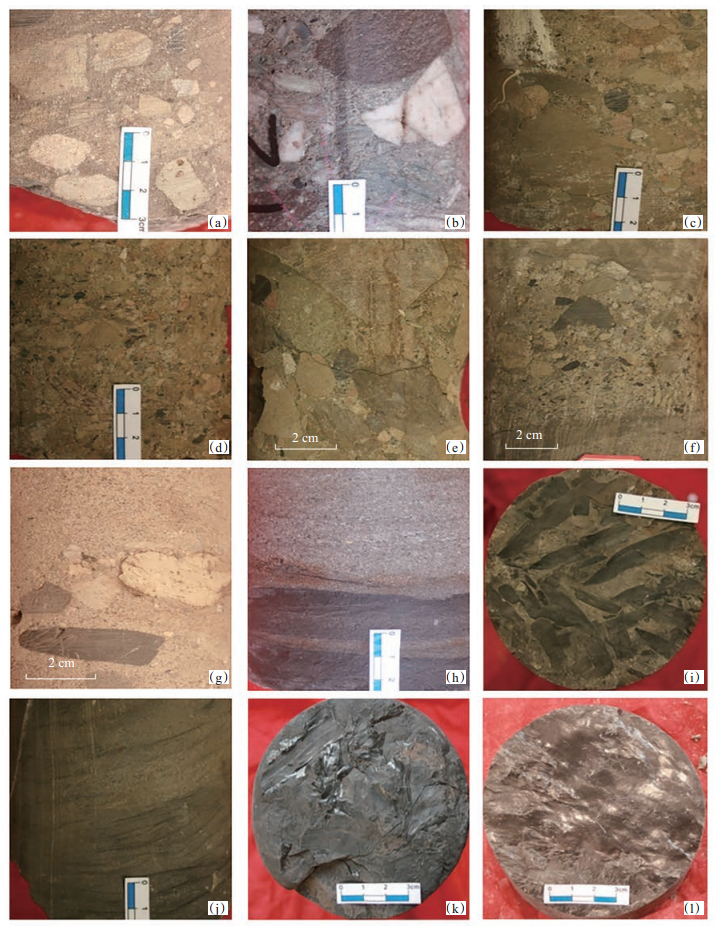 下载eps/tif图 图 2 徐家围子断陷北部沙河子组典型岩心照片 (a)褐色泥质支撑漂浮砾岩,砾石大小不一,以次圆—次棱角状为主,为扇三角洲泥石流沉积,宋深4井,3 154.26 m;(b)灰色砂质支撑砾岩,可见次棱角状砾石,为扇三角洲前缘河道砂质碎屑流沉积,达深302井,3 447.83 m;(c)杂色细砾石支撑漂浮中砾石,砾石直径可达4 cm,为扇三角平原辫状分流河道砾石质碎屑流沉积,达深3井,3 514.33 m;(d)杂色等粒级颗粒支撑砾岩,砾石直径普遍小于1 cm,为扇三角平原辫状分流河道砾石质碎屑流沉积,达深3井,3 513.39 m;(e)杂色多粒级颗粒支撑砾岩,砾石大小混杂,磨圆差,以次圆—次棱角状为主,为扇三角洲平原砾石质碎屑流沉积,达深3井,3 512.87 m;(f)褐色砂砾岩中见冲刷面构造与岩性突变面,为扇三角洲平原辫状分流河道沉积,达深3井,3 618.94 m;(g)褐色粗砂岩,见滞留沉积,为扇三角洲平原辫状分流河道沉积,宋深2井,3 353.47 m;(h)灰色粗砂岩与黑色泥岩突变接触,见冲刷面构造,为扇三角洲前缘水下分流河道沉积,达深4井,3 348.75 m;(i)灰褐色含砾砂岩,底部见植物化石,为扇三角洲平原漫滩沉积,达深3井,3 618.94 m;(j)灰黑色泥质粉砂岩,砂纹层理,为扇三角洲前缘水下分流间湾沉积,达深2井,3 864.64 m;(k)黑色炭质泥岩,为扇三角洲前缘水下分流间湾沉积,达深3井,3 619.74 m;(l)褐色泥岩,见贝壳状断面,为扇三角洲平原漫滩沼泽沉积,宋深4井,3 226.76 m Fig. 2 Typical photos of cores from Shahezi Formation in the northern Xujiaweizi Fault Depression |