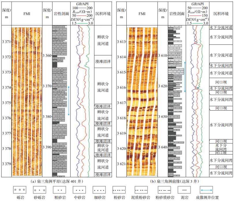 2.3 测井响应特征扇三角洲沉积物由于属于近源堆积,通常具有厚度变化大和岩性变化快的特征,且砂砾岩在常规测井与成像测井上均有特殊的响应特征。在研究区,由于盆地范围小,来自短轴物源方向的砂砾岩沉积普遍具有低成熟度和高泥质含量的特征,它们在常规测井曲线上的箱型特征有时候不明显,其GR曲线可呈中幅齿状或齿化箱状特征(图 3)。统计数据显示,研究区扇三角洲砾岩GR值为80~ 110 API,部分砾岩甚至与泥岩的GR数值相近。在成像测井上,扇三角洲平原粗粒沉积物通常具有暗色背景下的亮斑响应,亮色斑块大小不一,表现出亮色高阻和暗色低阻相混杂的特征[图 3(a)]。在扇三角洲前缘,由于水下分流河道沉积物搬运距离较远,分选稍好,其测井响应往往与扇三角洲平原沉积相比具有明显的差异,可见到典型的箱状和相对规则的成像条带响应特征[图 3(b)]。