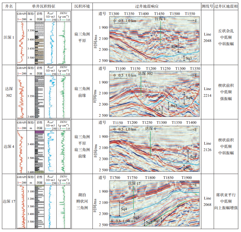 2.4 地震相特征地震相是沉积体较直观的地球物理响应特征之一,它对于判别沉积类型、分析无井区沉积相具有重要作用[20-22]。从徐家围子北部沙河子组东西向地震剖面来看,不同单井标定的扇三角洲沉积物在地震相响应特征上存在一些差异,但总体以典型的中低频楔状前积反射、丘状或楔状杂乱反射为特征,与研究区代表辫状河三角洲和湖泊沉积物的平行—亚平行连续反射结构明显不同(图 4)。如汪深1井,在单井上表现为褐色砂砾岩与泥岩互层沉积,测井曲线箱状响应不明显,属于典型的扇三角洲沉积环境,而在地震剖面上该井就表现为丘状杂乱反射特征,属于扇三角洲沉积体的横截面典型响应。由此通过单井沉积相-地震相标定与对比,明确了扇三角洲的地震响应特征,即以丘状、楔状杂乱反射或楔状前积反射为主。