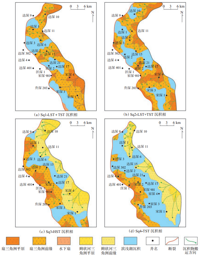 通过单井沉积相分析,结合地震标定和地震相解释,分析了徐家围子北部扇三角洲的平面展布规律(图 6)。在沙河子组沉积初期(Sq1~Sq2),研究区进入强烈断陷初始阶段,裂陷活动大规模发生[16-18],但由于主控断裂(徐西断层)为近南北向展布,裂陷区分布较窄,盆地范围小,来自短轴方向的物源供给充足,在该时期东部相对缓坡区和西部陡坡带均广泛发育扇三角洲沉积[图 6(a)~(b)];沙河子组沉积中期(Sq3),徐西断裂持续活动,沉积中心逐渐向西迁移,东部缓坡带地貌单元不断扩张,盆地范围进一步扩大,在不同的构造部位,沉积相带开始出现分异,西部陡坡带以扇三角洲沉积为主,东部缓坡带则逐渐出现辫状河三角洲沉积[图 6(c)];沙河子组沉积晚期(Sq4),盆地范围继续扩大并在Sq4—TST沉积期达到最大,该时期盆地东部缓坡带整体为辫状河三角洲沉积,扇三角洲则主要出现在西部断裂陡坡带,不同构造带的沉积相分异特征明显[图 6(d)],表明扇三角洲沉积体系在不同盆地充填阶段的分布特征存在较大差异。
