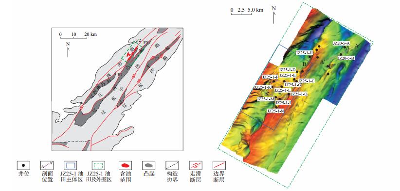 下载eps/tif图 图 1 锦州25-1油田构造位置及沙二段顶面古地貌图 Fig. 1 Structural location of Jinzhou 25-1 oilfield and superface paleogeomorphology of the second memberof Shahejie Formation |