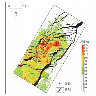 经过对比,当概率值大于0.6时,反演出的储层厚度(时间域)与实际钻井钻遇的储层厚度(时间域)较为接近,且在反演剖面上与实际钻井的吻合度较高(图 9)。因此,当概率值大于0.6时,反演结果能够很好地表征区内储集砂岩的厚度与分布。通过精确的时深转换,将反演得到沙二段储层厚度时间域平面图,生成深度域平面图(图 10)。区内沙二段地层厚度为80~200 m,根据已钻井分析及长期勘探经验,将储层厚度大于50 m作为优质储层定量评价的基础。图 10中由绿色向红色过渡的区域即为储层厚度由50 m过渡到150 m的区域,是有利的储层发育区。