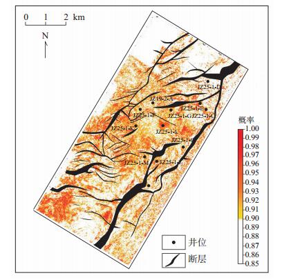 计算砂岩孔隙度时,首先统计井点储层的平均概率值与平均孔隙度的关系(图 11),从图 11中可以看出,随着孔隙度增加,储层的平均概率值也随之增加,二者之间具有一定的正相关关系;其次分析实际钻井数据,发现储层平均孔隙度大于20%的井所对应的储层平均概率值均大于0.9,因此,以0.9为阈值,可以刻画孔隙度大于20%的优质储层的分布范围(图 12)。由于本次研究中样本点有限,保守预测图 12中由黄色向红色过渡区域的储层孔隙度为20%~24%,不排除局部会有更高的孔隙度值。