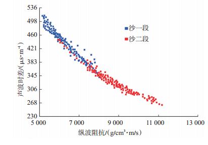下载eps/tif图 图 3 锦州25-1油田沙一段和沙二段声波时差与纵波阻抗交会图 Fig. 3 Crossplot of acoustic time and P-wave impedance of the first and second members of Shahejie Formation in Jinzhou 25-1 oilfield |