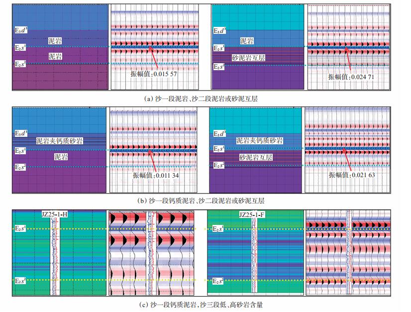 图 4(b)中,假设沙一段为泥岩夹薄层泥质白云岩(含钙质),沙二段分别为泥岩或砂泥互层等2种情况。其中,沙一段中的泥岩共94 m,泥质白云岩共3层,每层厚度为2 m。当沙二段为100 m纯泥岩时,计算得出沙二段顶面(蓝色波峰)的振幅值为0.011 34;当沙二段为砂、泥岩分别以10 m的厚度互层沉积时(砂地比为0.5),计算得出沙二段顶面(蓝色波峰)的振幅值为0.021 63。同样可得出沙二段砂岩含量越高,其顶面振幅值越大的结论。因此,无论沙一段含不含钙质,只要沙二段从泥岩过渡到砂岩,沙二段的顶面振幅便是增强的[图 4(a)~(b)]。