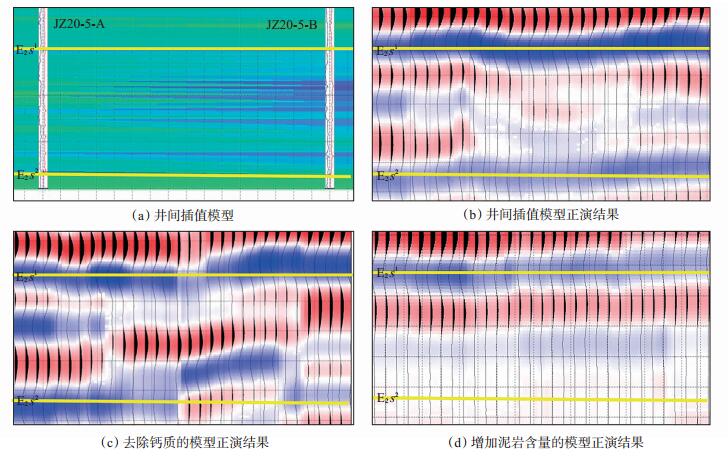 锦州25-1油田东侧的锦州20-5背斜为富砂含油气构造(参见图 2),该构造的地震反射特征是同相轴不连续且呈叠瓦状。从沉积环境来看,由于辫状河三角洲砂体沉积区的水动力较强、砂体相互叠置,常常导致地震反射轴不连续现象发生;钙质及泥岩发育区,由于远离物源区且水动力较弱、沉积物分布稳定,地震同相轴往往较连续。因此,可以利用地震同相轴连续性的差异来反映沉积环境的差异,进而刻画出不同类型沉积岩性体的分布范围[图 5(b)]。JZ20-5-A井处的沙二段为正常砂泥岩互层沉积,JZ20-5-B井处的沙二段含有2层厚度均为1.6 m的钙质砂岩。区内沙二段发育砂岩、钙质砂岩和泥岩等3种岩性,为明确各种岩性含量对同相轴连续性的影响,选用25 Hz的雷克子波进行井间插值正演,模拟由于钙质和砂泥岩含量不同所引起的地震同相轴连续性的变化情况。图 6(a)为JZ20-5-A和JZ20-5-B这2口井引入密度与声波时差曲线的井间插值模型,图 6(b)为图 6(a)对应的点震源垂直入射自激自收正演剖面。首先,分析钙质含量减少对地震同相轴连续性的影响,将JZ20-5-B井中对应的钙质砂岩部位的测井曲线替换成储集砂岩测井曲线,则正演生成的沙二段地震同相轴变得不连续[图 6(c)],说明了钙质含量与同相轴连续性呈正相关关系;其次,分析泥岩含量增加时对地震同相轴连续性的影响,将JZ20-5-B井中储集砂岩部位的测井曲线替换成泥岩测井曲线,则正演生成的沙二段地震同相轴变得连续[图 6(d)],说明泥岩含量增加也会导致同相轴变连续。综上所述,可以推断,同相轴连续的部位可能有钙质存在或泥岩含量高,储层不发育;同相轴不连续的部位,储集砂岩比较发育。因此,采用能够表征同相轴差连续性的相干体最小振幅属性可以定性预测储集砂岩的分布[图 5(b)],其中,低值的黄色区域定性预测出了储集岩砂体的分布范围。