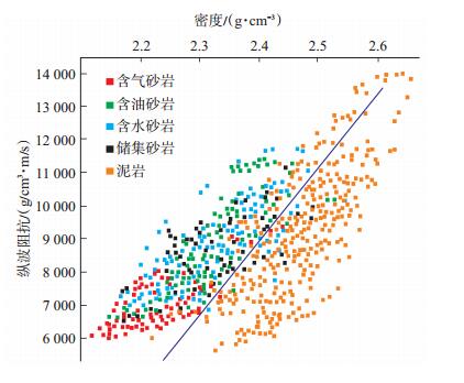 2.2 岩石物理分析岩石物理分析的思路主要是对井数据进行统一处理,并分析和求取储层敏感参数,从而建立岩石物理属性与地震数据之间的桥梁,用于判别岩性,划分储层与非储层[29-31]。通过对锦州25-1油田进行多井多参数的交会分析,发现密度与纵波阻抗交会结果能够较好地区分储层与非储层,相对于泥岩,砂岩表现为低密度、高纵波阻抗的特征(图 8)。