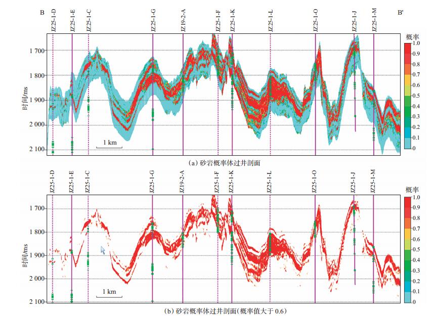 下载eps/tif图 图 9 锦州25-1油田砂岩概率体过井剖面(剖面位置见图 1) Fig. 9 Cross-well profile of sandstone probability body in Jinzhou 25-1 oilfield |