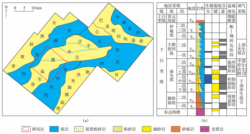 下载eps/tif图 图 1 海拉尔盆地构造区带(a)与地层综合柱状图(b) ①贝北低隆;②霍多莫尔构造带;③苏德尔特构造带;④塔拉汗构造带 Fig. 1 Structural zones (a) and stratigraphy column (b) of Hailar Basin |