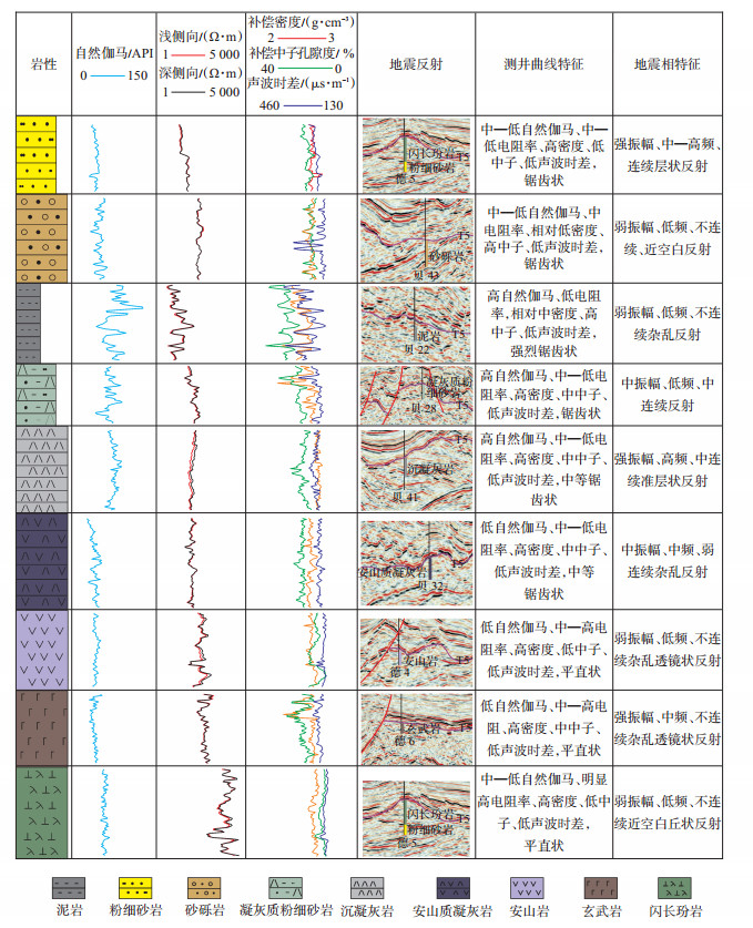 火成岩类中的安山岩、玄武岩、闪长玢岩为低振幅低频杂乱反射,常见外部具丘形、透镜状反射形态。粉细砂岩、凝灰质粉细砂岩、沉凝灰岩受原岩沉积作用及岩性变化影响,为中—高振幅较连续地震相,表现为层状反射。砂砾岩、泥岩、安山质凝灰岩内部岩性变化小,为中—弱振幅不连续杂乱反射,无明显外部反射形态(图 2)。