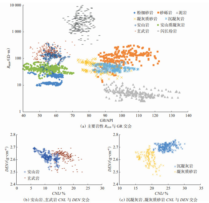 中子测井(CNL)在反映暗色矿物含量高的岩性方面有一定优势[25],但本区岩性不纯,特征不明显。基底埋藏较深且经历浅变质作用,声波时差(DT)对岩性的区分度不大。整体上沉积岩与火山碎屑沉积岩包括粉细砂岩、砂砾岩、泥岩、凝灰质粉细砂岩,受岩石孔隙结构变化影响,三孔隙度测井曲线呈锯齿状、起伏变化大;沉积火山碎屑岩与火山碎屑岩类包括沉凝灰岩、安山质凝灰岩,三孔隙度测井曲线呈弱锯齿状、变化较小;火成岩类包括安山岩、玄武岩、闪长玢岩,三孔隙度测井曲线变化更小,基本为平直状,反映岩石更致密。测井曲线交会结果显示,自然伽马与电阻率交会可区分9种岩性中的5种及2种岩性组合,5种岩性包括粉细砂岩、砂砾岩、泥岩、安山质凝灰岩、闪长玢岩,2种岩性组合为安山岩与玄武岩组合、沉凝灰岩与凝灰质砂岩组合[图 3(a)]。在自然伽马与电阻率交会基础上,再通过补偿密度与补偿中子孔隙度交会可以区分安山岩与玄武岩,沉凝灰岩与凝灰质砂岩[图 3(b)~(c)],因此,以上述方法为基础,通过测井曲线综合交会达到9种岩性测井识别的目的。主要岩性测井响应值如表 2所列。