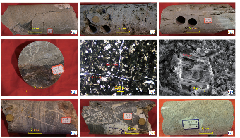 下载eps/tif图 图 4 海拉尔盆地布达特群不同岩性储层特征 (a)细砂岩,未充填高角度裂缝,贝15井,2 225.70 m;(b)蚀变砂岩,溶蚀孔洞,贝16-B2井,1 857.05 m;(c)蚀变砂岩,溶蚀扩大缝及孔洞,贝16-B2井,1 856.40 m;(d)泥质粉砂岩,多期充填裂缝发育,呈网状,贝28井,1 931.89 m;(e)安山质凝灰岩,两期裂缝切割发育,钙质充填,贝12井,1 706.10 m,SEM;(f)蚀变不等粒砂岩,长石颗粒被溶蚀,贝15井,2 207.00 m,SEM;(g)裂缝终止于砂质岩与泥质岩界面附近,贝28井,1 922.65 m;(h)断层角砾岩,碎裂带内钙质胶结物溶蚀孔洞,贝28井,1 935.40 m;(i)安山岩,储层不发育,德4井,2 012.19 m Fig. 4 Reservoir characteristics for different lithologies of Budate Group in Hailar Basin |