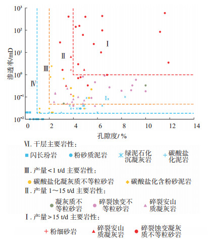 Ⅰ类岩性序列为含火山碎屑沉积岩、中—细粒沉积岩岩,主要为粉细砂岩、碎裂蚀变不等粒砂岩、凝灰质砂岩。发育裂缝-孔隙型储层,裂缝与孔隙沟通,物性好,产量较高,日产油>15 t;Ⅱ类岩性序列为火山碎屑岩,主要为安山质凝灰岩,包括碎裂安山质凝灰岩、碎裂蚀变安山质凝灰岩。发育孔隙型或裂缝型储层,孔隙型为主的储层孔隙发育但缺乏沟通孔隙的裂缝,压裂后可获得产能,多口井的试油数据表明压裂前后产量变化大,甚至干层经压裂后变为产层。裂缝型为主的储层裂缝发育而孔隙不发育,裂缝能改善渗透性但其本身的储集性能有限,造成初期产量高,后期迅速衰减,物性中等,日产油一般在1~15 t;Ⅲ类岩性序列为沉积火山碎屑岩和沉积岩中的泥质岩,包括绿泥石化沉凝灰岩、碳酸盐化泥岩、粉砂质泥岩。储层裂缝与孔隙均发育较差,物性差,压裂后产量低,一般日产油>1 t或为干层;Ⅳ类岩性序列为中基性火山熔岩类,包括闪长玢岩、蚀变安山岩、玄武岩。裂缝与孔隙基本不发育,物性差,压裂后评价为干层。
