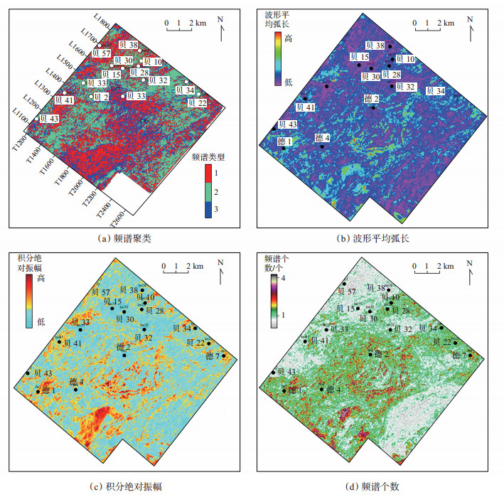 下载eps/tif图 图 6 德2三维区地震频谱聚类与多属性分析 Fig. 6 Seismic spectral clustering and multi-attribute analysis in De 2 area |