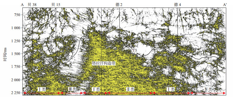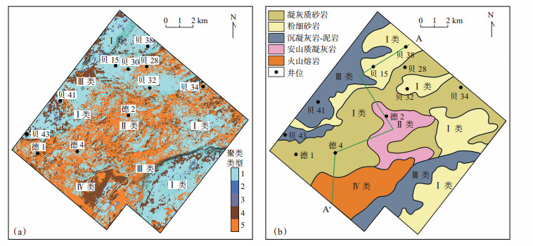 5 储层岩性序列预测储层岩性序列预测分为3步:首先用频谱聚类法区分火山岩和砂岩。与钻井结果对比表明,类型1频谱发育区与钻井揭示的火成岩、安山质凝灰岩吻合,类型2频谱发育区与凝灰质砂岩、粉细砂岩较吻合,类型3频谱发育区对岩性识别效果一般[图 6(a)]。再用多种地震属性融合与聚类方法,优选波形平均弧长、积分绝对振幅、频谱个数等3个对岩性敏感的有效属性[图 6(b)~(d)]。然后用神经网络聚类法将上述3类属性的融合体细分为5个类型,其中类型1范围与钻井揭示粉细砂岩吻合,类型2和4与沉凝灰岩—泥岩范围吻合,类型5代表凝灰质砂岩、安山质凝灰岩、火成岩范围[图 7(a)]。将上述频谱聚类与多属性融合聚类2种方法代表的岩类分布范围综合,可预测该区岩性序列平面分布[图 7(b)],代表不同级别的储层发育带。其中Ⅰ类岩性序列包括凝灰质砂岩—粉细砂岩类,粉细砂岩主要分布于贝15、贝38、贝32井区和塔拉汗构造带东部,凝灰质砂岩分布于塔拉汗构造带中部德4、德1、贝34井区;Ⅱ类岩性序列主要为安山质凝灰岩,主要分布于塔拉汗构造带中部德2井区;Ⅲ类岩性序列包括沉凝灰岩与泥岩类,分布于塔拉汗构造东西两侧地区;Ⅳ类岩性序列包括玄武岩等中基性熔岩,分布于塔拉汗构造带中南部。蚂蚁体裂缝预测显示,从3D工区北东—南西方向,储层随岩性序列变化呈现规律性变化,Ⅰ,Ⅱ类岩性序列区储层发育,Ⅲ,Ⅳ类岩性序列区储层发育差(图 8),预测结论均与钻井揭示结果吻合。