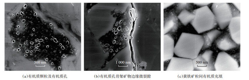 2 实验结果与分析 2.1 聚焦离子束扫描电镜对样品进行氩离子抛光处理后利用聚焦离子束扫描电镜观察实验。从图 1中发现该页岩发育大量的黄铁矿和有机质,以及粒间孔、矿物晶间孔、溶蚀孔等。通过对有机质孔进行进一步观察发现,有机质颗粒中含有大量孔隙,孔隙形状主要呈椭球形或近球形,还有弯月状或平板状等[图 1(a)~(b)],直径从几纳米到几百纳米,孔与孔之间有微小喉道连接,同时还存在一些有机质颗粒与微米级的矿物边缘裂缝相邻,如此大量的有机质孔提供了巨大的比表面积,而且孔隙的吸附势能与孔径呈反比,孔径越小,吸附能力越强。页岩中还存在大量黄铁矿集合体,其中一些黄铁矿颗粒之间发育大量微孔、介孔的有机质充填[图 1(c),黑色部分为有机质,白色部分为黄铁矿颗粒]。