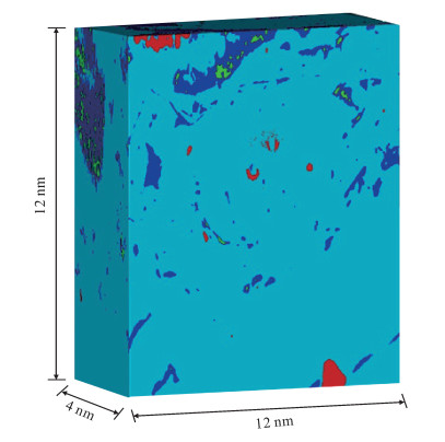 经过上述FIB-SEM切割和成像后,得到260张清晰的连续图像,将其导入到avizo软件中,即可实现页岩微观孔隙结构的三维重构,如图 2所示,深蓝色代表有机质孔隙,绿色代表黄铁矿,红色代表无机矿物。