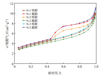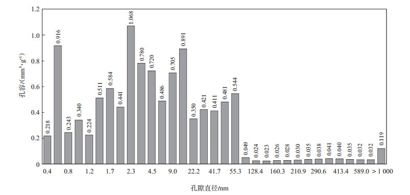 样品等温升压吸附曲线接近BDDT(BrunauerDeming-Deming-Teller)分类中的Ⅱ型吸附等温线形态(图 4),吸附曲线前段缓慢上升,吸附由单分子层向多层过渡,后段急剧上升且未出现饱和,说明样品中含有一定量的介孔和宏孔。