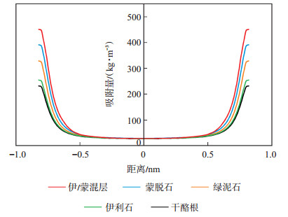根据SLD可以模拟不同物质(蒙脱石、伊利石、高岭石和干酪根等)孔喉中、以及直径为2 nm孔喉中30 MPa下甲烷的密度分布[27-29](图 6)。从吸附能力上看,干酪根 > 蒙脱石 > 伊/蒙混层 > 伊利石 > 绿泥石。越靠近孔喉壁面,甲烷的密度越高,越靠近孔喉中心,甲烷密度越接近体相密度;孔隙直径越大,吸附态甲烷占比越小。