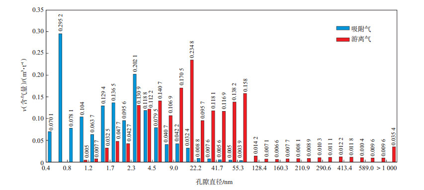 下载eps/tif图 图 7 样品N不同孔径中吸附气和游离气含量 Fig. 7 Content of adsorbed gas and free gas in sample N with different pore sizes |