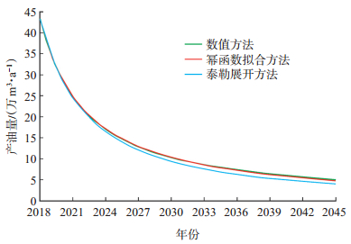 利用以上3种方法分别预测了渤海Q油田北区块的产量曲线(图 3),从预测结果可以看出:在预测初始6年内(2018—2023年)2种近似方法预测与数值方法计算的甲型水驱产量曲线差异不大,而当预测达到6年之后(2024—2045年),泰勒展开方法与数值方法计算的甲型水驱产量曲线的误差逐渐增大,而本文提出的含油率幂函数拟合方法则一直保持着比较好的拟合效果。